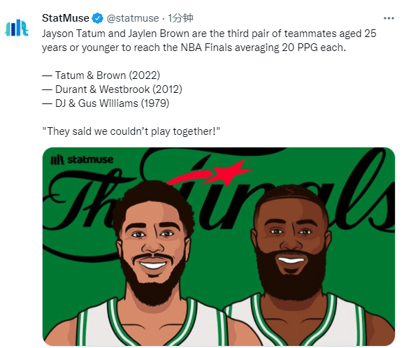 3、塔图姆和布朗成为历史第三对在25岁及以下场均20+晋级总决赛的队友。