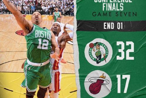 JRS直播网05月30日讯 ,NBA东部决赛第7场打响。结果此役开场,客场作战的凯尔特人便打出了非常猛烈的进攻输出,20-7梦幻开局。随后凯尔特人继续扩大优势,首节结束已经32-17领先热火15分。对于热火来说,他们再度被逼入绝境。