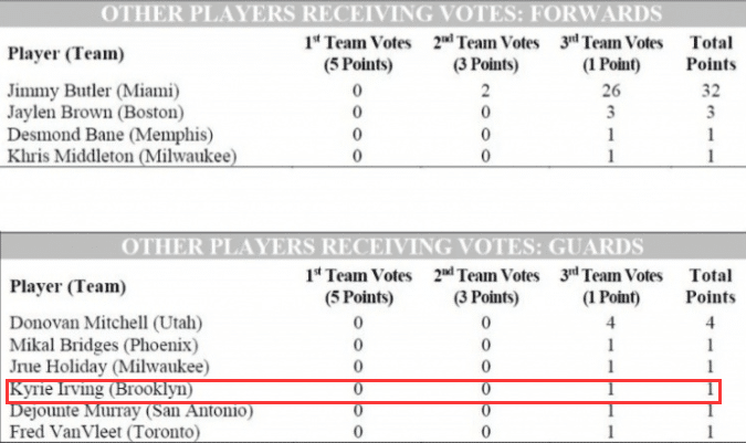 这其中欧文也获得了一张最佳阵容选票,确实比较尴尬,要知道的是本赛季的欧文在场内外引发巨大的争议,他场均27.4分4.4篮板5.8次助攻1.4次抢断和0.6次盖帽的数据,但本赛季欧文只在常规赛出战了29场比赛,仅仅三分之一的比赛。