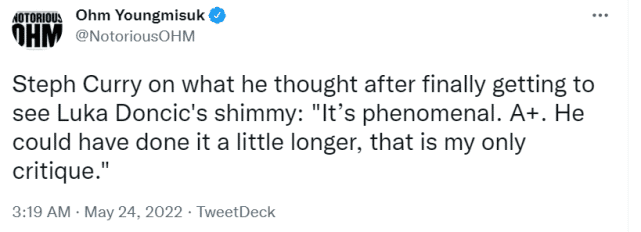 东契奇在昨天的比赛首节命中压哨三分后跳抖肩舞庆祝。昨天赛后,库里就被问及此事,他表示自己没注意到,回去看看录像再回复。今天他也如约给出了他的答案。“非常棒,我给他A+的评分。但这段舞有些短,他可以再跳得稍微久一些,这是我唯一的批评。”