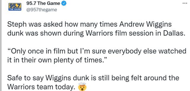 西决G3的比赛相当精彩,高光时刻不少,最抢眼的莫过于维金斯隔扣东契奇。库里也被问到今天的录像回放课大家看了多少遍维金斯的扣篮。“只看了一遍,但我相信大家自己都看过很多遍了。”库里回应道。维金斯在西决G3轰下27分11篮板,得分破季后赛生涯纪录,篮板平季后赛生涯纪录。库里还表扬了小将穆迪。“他是一个很有天赋、智商极高的年轻人,不知疲倦地做好一切准备。”