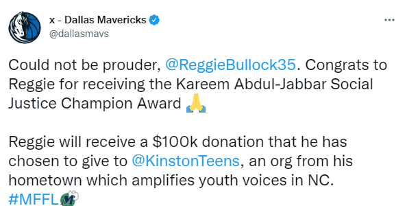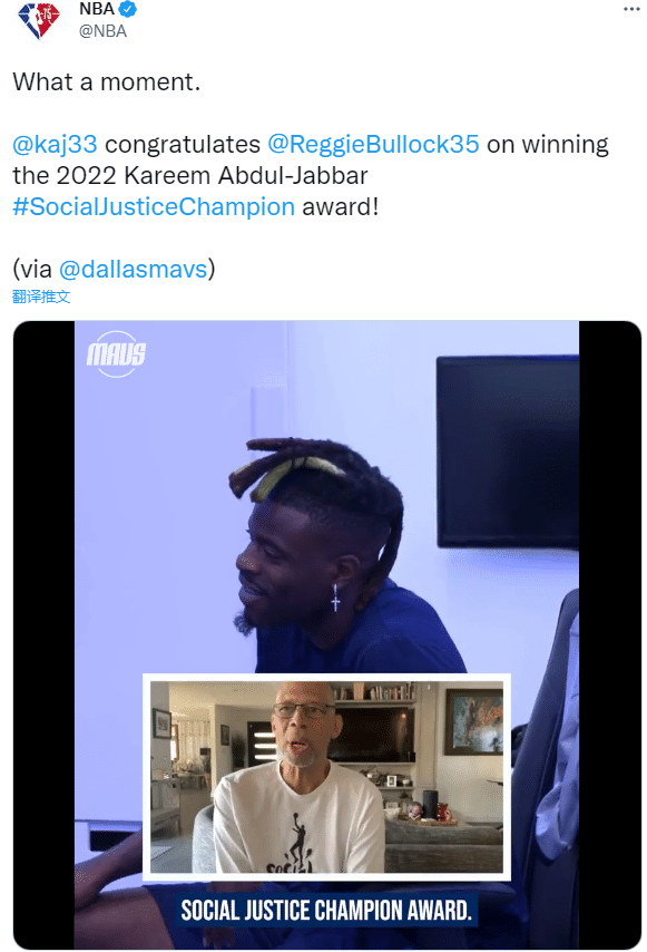 独行侠官方发推,恭喜雷吉-布洛克荣获2022年的贾巴尔社会公正冠军奖。布洛克将捐赠10万美元给到家乡一个名为“KinstonTeens”的组织,以更好地在北卡罗来纳州为青少年发声。