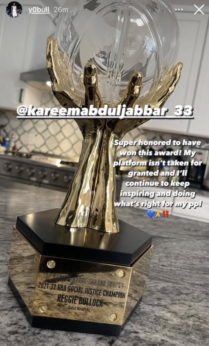 布洛克晒奖杯并且配文:贾巴尔,超级荣幸能够赢得这个奖!我的这个平台不是理所当然的,我将继续激励他人并且为我的支持者做正确的事情。