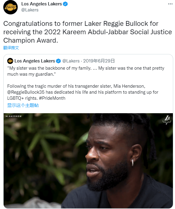 湖人官方向布洛克表达了祝贺,发推写道:祝贺前湖人球员雷吉-布洛克获得2022年贾巴尔社会正义冠军奖。NBA官方也祝贺布洛克。