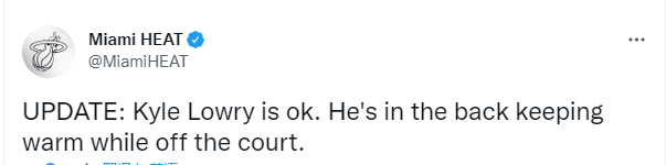 JRS直播网05月22日讯 ,NBA季后赛东决G3正式打响,热火后卫凯尔-洛瑞火线复出,不过第一节仅打5分钟,便因伤离场返回更衣室;之后热火官方更新伤情并且报平安:凯尔-洛瑞没问题,他会重新上场的。