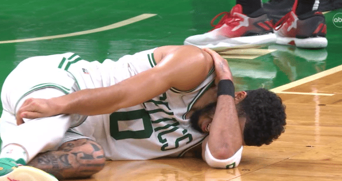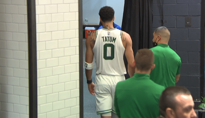 末节塔图姆的右肩受伤,倒地不起十分痛苦,之后离场返回更衣室;之后塔图姆回到替补席并且重新上场,倒地拼抢地板球。