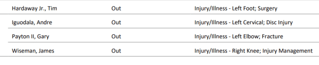 JRS直播网05月20日讯,NBA官方公布了西决G2的伤病报告,勇士和独行侠共有4人缺席。独行侠一方缺阵的是小哈达威,他因左脚伤势已经赛季报销。勇士一方缺阵的人员也没有变化,伊戈达拉(颈椎伤病)、小佩顿(左肘骨折)和怀斯曼(右膝伤病)将继续缺席G2的比赛。