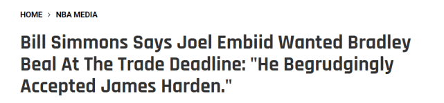 JRS直播网05月19日讯 ,据名嘴Bill Simmons报道,恩比德最想联手的球员是奇才的比尔,实际上他是不情愿地接受了哈登的交易,因为76人当时无法得到比尔了。