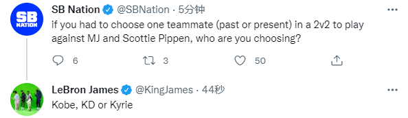 美媒SB Nation问:如果你必须在 2v2 中选择一名队友(过去或现在)来对抗乔丹和斯科蒂-皮蓬,你会选择谁?詹姆斯回答:科比、杜兰特或者欧文。