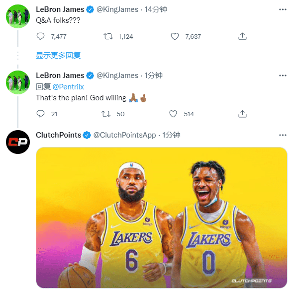 网友问:你100%打算和布朗尼一起打比赛?詹姆斯回答:这就是计划,愿上帝保佑。