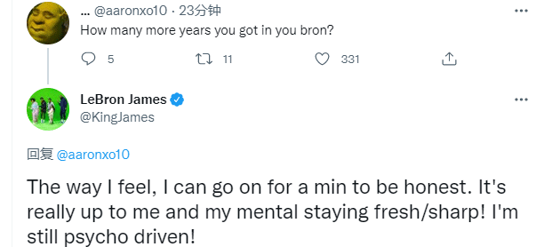 网友问:勒布朗,你还能打多少年?詹姆斯回答:说实话,这取决于我能让我的心理保持新鲜和敏锐(多久),我仍然是个心理驱动型的人。