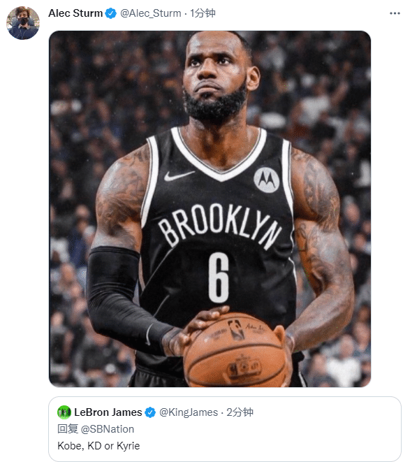 篮网记者Alec Sturm晒詹姆斯身穿篮网6号球衣,调侃詹姆斯未来加盟篮网。