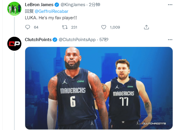 网友问:最喜欢的25岁以下的球员?詹姆斯回答:卢卡-东契奇,他是我喜欢的球员;美媒ClutchPoints晒P照恶搞詹姆斯加盟独行侠联手东契奇。