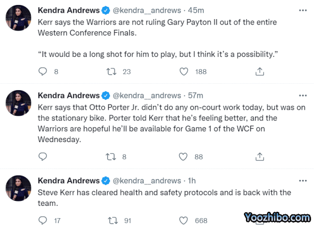 JRS直播网05月16日讯 ,勇士喜迎三大利好:科尔已经解除健康安全协议,回归勇士;波特伤势好转,有望G1复出;勇士并未排除小佩顿西决复出的可能性。