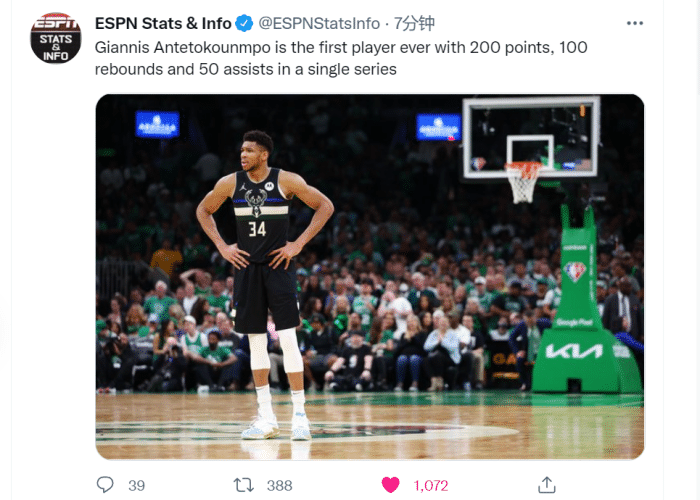 7场比赛,字母哥场均可以送出34分15板7助攻的全能数据,单轮系列赛3次砍下至少40分10板,G6成为NBA季后赛历史第4位单场送出至少40分20板5助攻的球员,而且单轮系列赛砍下了200+得分100+篮板50+助攻,是NBA75年历史首位在单轮系列赛送出至少200分100板50助攻的球员。