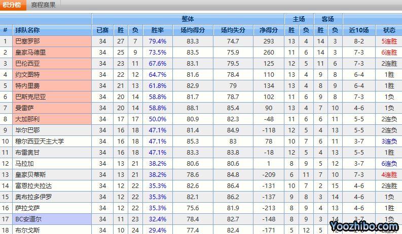 JRS直播网05月16日讯 本赛季西班牙篮球甲级联赛常规赛正式落下帷幕,巴塞罗那27胜7负排名第一,力压皇家马德里的25胜9负,一共18支球队,前8名晋级到季后赛,最后一名垫底的球队将会降级。很遗憾,本赛季西甲垫底的球队是布尔戈斯,他们战绩定格在10胜24负,排名倒数第一,降级到乙级联赛。