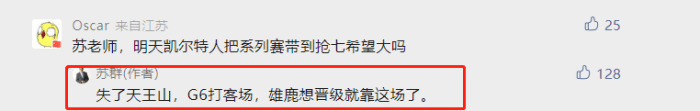 此前,有球迷就在社媒上提问苏老师,对于绿军雄鹿这一轮系列赛的看法,绿军能不能将比赛拖入到抢七大战中。而苏群当时的回应是,雄鹿队虽然3-2领先,但想要晋级,就靠G6了。但最终的结果是,雄鹿队在G6中输球,大比分来到3-3,而抢七大战,绿军主场迎战雄鹿队,占尽天时地利人和的优势。所以,绿军现在晋级东部决赛的可能性很大,甚至,雄鹿队已经没有了机会。