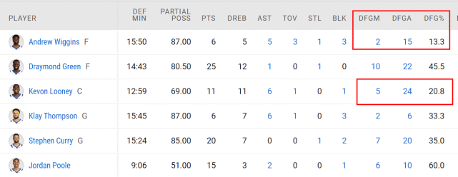 JRS直播网05月15日讯 勇士在G6一战中110-96击败灰熊,以4-2的总比分晋级。96分也是灰熊在这轮系列赛中的单场最低分。NBA官方公布了勇士和灰熊G6的防守数据,维金斯和卢尼在防守端表现强悍,两人合计只让对手39投7中,命中率不到18%!