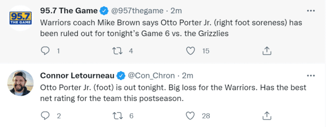 JRS直播网05月14日讯 ,勇士代理主教练迈克-布朗宣布,奥托-波特因右脚酸痛将不会出战今天勇士vs灰熊G6的比赛。勇士跟队记者Connor Letourneau表示,勇士遭遇重大损失,波特的净效率值在季后赛排名全队第一。