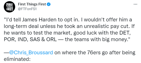 Brian Windhorst则表示:现在联盟中没有人相信76人会给哈登一份顶薪续约合同。
