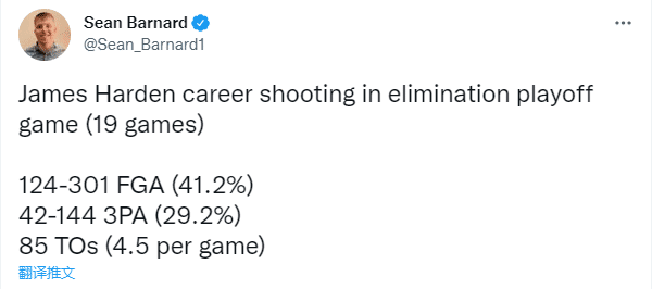 今年季后赛,哈登出战12场比赛,场均上场39.9分钟拿到18.6分8.6助攻5.7篮板,投篮命中率40.5%和三分命中率36.8%;在76人和热火G6生死战,哈登全场9投4中仅仅拿到11分,没有罚球,下半场2投0中一分未得,关键时刻掉链子。