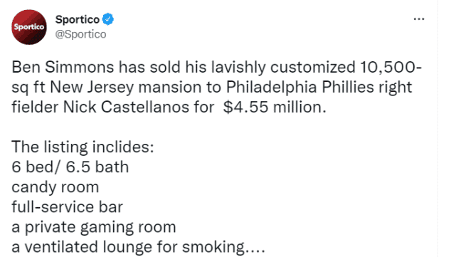 JRS直播网05月13日讯 ,据知名体育商业媒体Sportico报道,篮网球星本-西蒙斯以455万美元的价格将自己定制的新泽西豪宅卖给卡斯特拉诺斯,后者是一位职业棒球运动员。西蒙斯这座豪宅面积约975平方米,有6个卧室、6.5个卫生间、游戏室、私人电影院等设施。走廊里,还陈列着他各个时期的球衣。西蒙斯的挂牌价是500万美元,最终以455万美元成交!