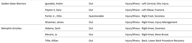 JRS直播网05月13日讯 ,勇士和灰熊提交了G6的伤病报告,双方6人确定缺席G6!勇士一方,伊戈达拉因颈部伤势缺阵,小佩顿因左肘骨折缺阵,怀斯曼因右膝伤病管理缺阵,波特右脚酸痛,目前是questionable(出场成疑,50%可能上场)。灰熊一方,确定缺阵的是蒂利(背部伤病)、阿尔达玛(膝伤),莫兰特(右膝骨挫伤)。莫兰特已经确定无缘G6一战,此前ESPN报道莫兰特预计赛季报销。