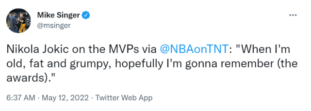 约基奇成为第13位能够做到蝉联MVP的球员。国际球员也连续4个赛季夺得常规赛MVP,上一位获得MVP的美国本土球员是2017-18赛季的哈登。