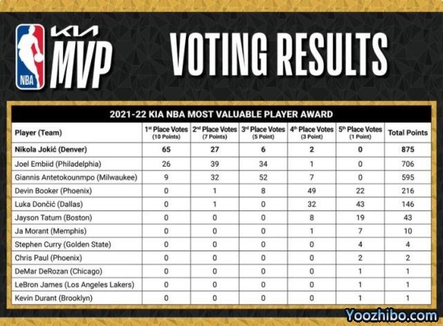 JRS直播网05月12日讯,NBA官方宣布,掘金中锋约基奇正式当选MVP。此前,ESPN已经提前爆料了这一消息。官方公布了MVP的票数分布情况,约基奇得到65张第一选票,27张第二选票,6张第三选票,2张第四选票,总分875分,恩比德总分706分,约基奇以169分的优势击败了大帝。字母哥595分,布克216分,东契奇146分,塔图姆43分,莫兰特10分,库里4分,保罗2分,德罗赞、詹姆斯、杜兰特各1分。