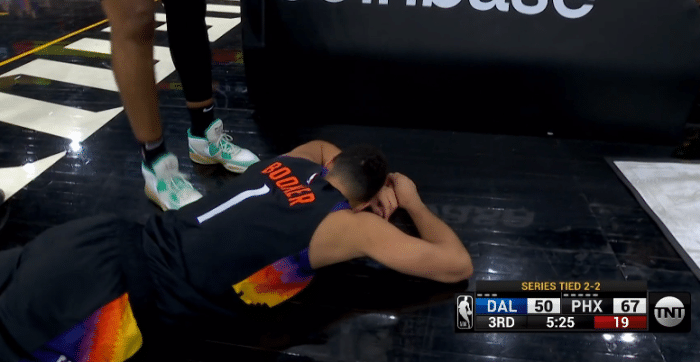 第三节5分25秒,布克持球突破杀到禁区,芬尼-史密斯凶狠犯规推飞布克,布克的身体失去平衡,重摔倒地十分痛苦,趴在地板上缓了一会后,布克被队友拉起来,此时布克笑了;裁判多角度回放这一幕,最终吹罚芬尼-史密斯一级恶犯,布克两罚一中,太阳17-0领先到10分。