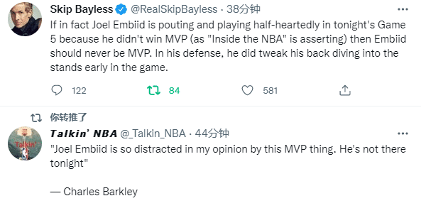 恩比德上半场6投2中仅仅拿到6分,NBA名宿巴克利表示:在我看来,恩跌因为MVP的事情分心了,他今晚不在状态;名嘴斯基普-贝勒斯则发推:如果恩比德因为没有赢得MVP而撅嘴并且没有一心一意打球,他永远都不会赢得MVP。