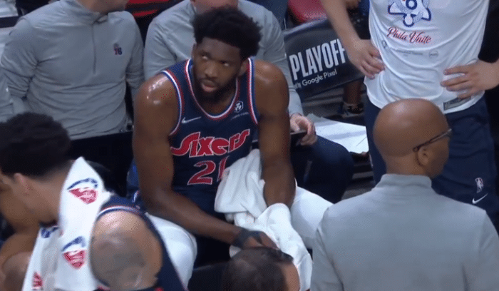 第二节,恩比德2投0中仅靠罚球拿到2分,还在一次保护篮板时痛苦倒地——恩比德被戴德蒙拍球砸到面部,前者捂着面部十分痛苦,里弗斯为大帝抱不平而吃到技术犯规。