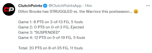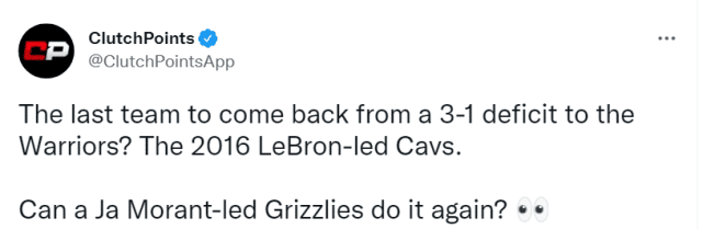 clutchpoints写道:“上一支1-3落后勇士成功翻盘的球队?2016年詹姆斯领军的骑士。莫兰特领军的灰熊会再次做到吗?”莫兰特目前伤情不明,下一场比赛能否复出仍是未知数。2016年总决赛上,骑士在1-3落后的情况下翻盘勇士,成为总决赛史上最经典的逆转。当然,这也只是个噱头,现在的灰熊无法和当年的骑士相比,毕竟,当家球星受伤,对他们影响很大。