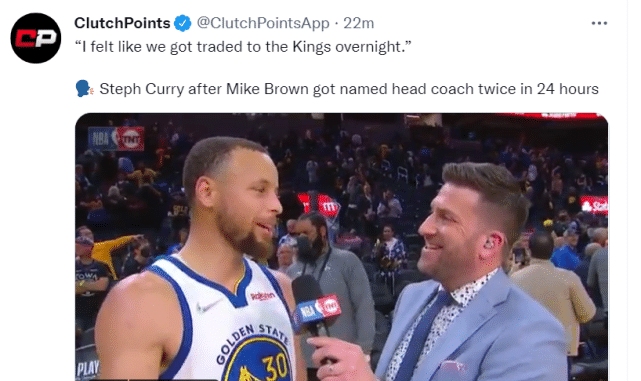 本场比赛,科尔赛前确诊新冠,不能执教比赛,已经确定下赛季执教国王的勇士助教布朗临危受命,他也不负众望,率队获胜。数据显示,布朗在勇士季后赛担任救火教练的12场比赛,勇士全胜,真是一大福星!库里赛后调侃:“我觉得我们一夜之间就都被交易到国王了。”显然,他是在开布朗的玩笑。
