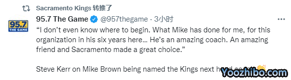 JRS直播网05月10日讯 ,国王队新帅正式确定,国王官宣正式任命迈克-布朗成为球队主教练,晒照并且发推:欢迎来到萨克拉门托;国王总经理发声,勇士主帅科尔直言勇士全队为他感到高兴。