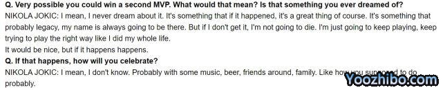 Mike Singer还报道称,自己在首轮第5战赛后曾经问过约基奇:如果再次当选MVP,他会如何庆祝?当时约基奇的回答是:“很可能是和亲友在一起,享受一些音乐和啤酒。应该和你想做的是一样的。”