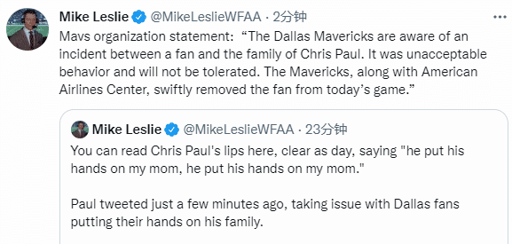 独行侠官方今日赛后针对保罗家人在比赛中的遭遇发表了声明:我们注意到了克里斯-保罗的家人与一位球迷的事件,这是不可接受的行为、不能被容忍。独行侠与美航中心迅速地将那位球迷移出了今天的比赛。