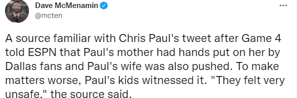 JRS直播网05月09日讯 ,NBA季后赛太阳客场再次不敌独行侠,系列赛大比分变成2-2;G4场边发生恶劣的冲突事件,据名记Dave McMenamin报道,有达拉斯球迷推搡了保罗的母亲和妻子,保罗的孩子亲眼目睹了这一切;赛后保罗爆粗表达愤怒情绪。