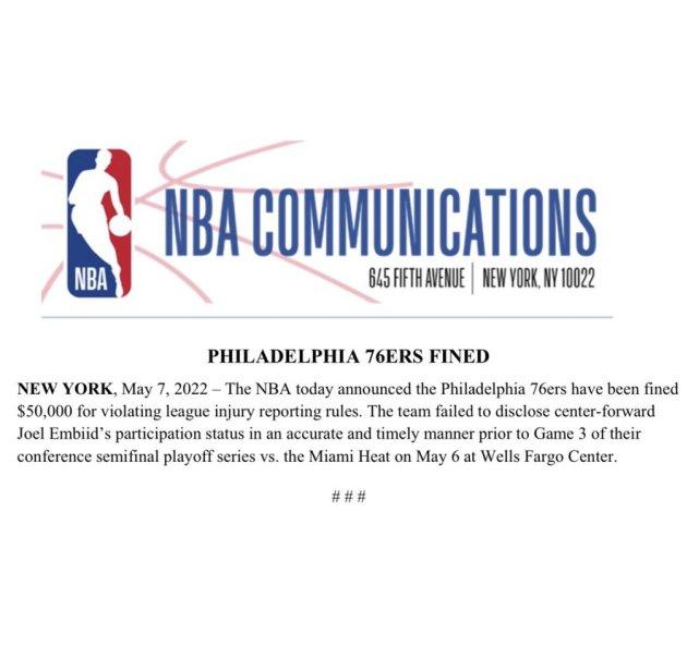 JRS直播网05月08日讯 ,NBA官方公布,76人因与热火G3赛前没有及时准确地更新恩比德的伤情,违反了联盟的伤病报告相关条例,被罚款5万美元。G3赛前,76人直到最后才确定恩比德复出,并在一天前将他出战状态列为“缺席”。
