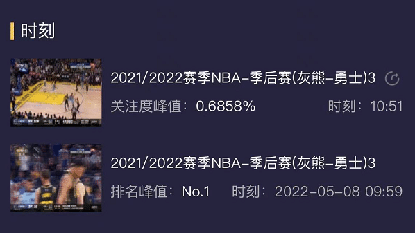 双方前两战莫兰特丢绝杀、克莱走步、惊险取胜、大比分战平,打得非常刺激,所以外界对于这场回到勇士主场大通中心球馆的比赛关注度很高。根据数据显示,勇士VS灰熊G3的电视台收视率巅峰时刻高达0.6858,同时间段全国第一。