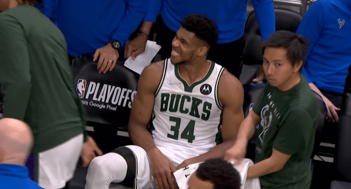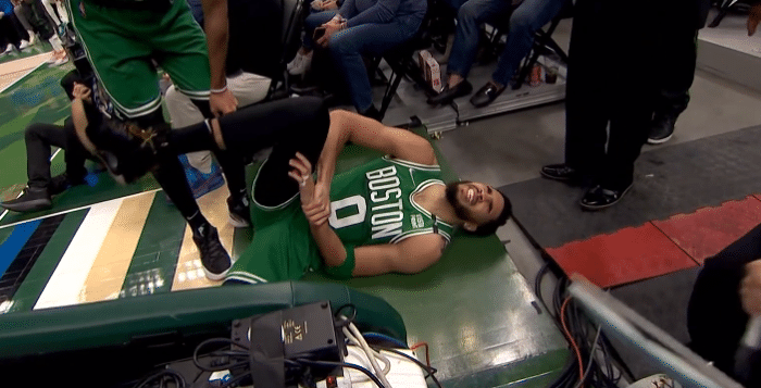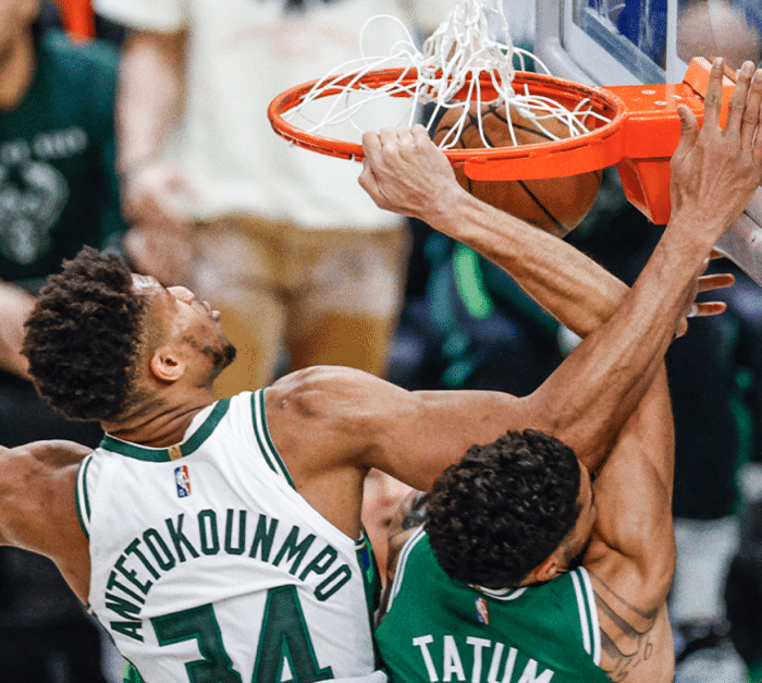 第二节,字母哥疯狂攻击绿军禁区,撞翻怀特并且挂着普理查德直接霸气扣篮、撞开霍福德又是暴扣,单节8投5中轰下12分5篮板,字母哥无人能挡,不过雄鹿半场46-50落后4分;期间字母哥试图封盖塔图姆被打扣成2+1,后者重摔倒地险些导致手腕受伤。