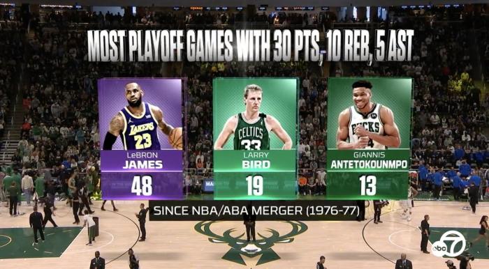 2、字母哥第32次在季后赛比赛中得到至少25分10板,队史第二,仅次于贾巴尔的41次。