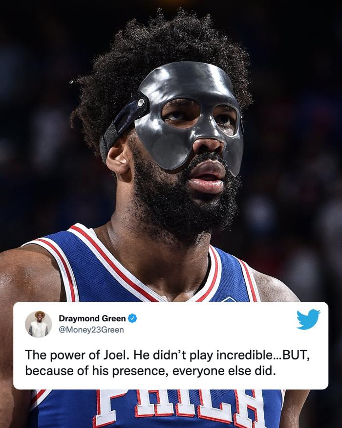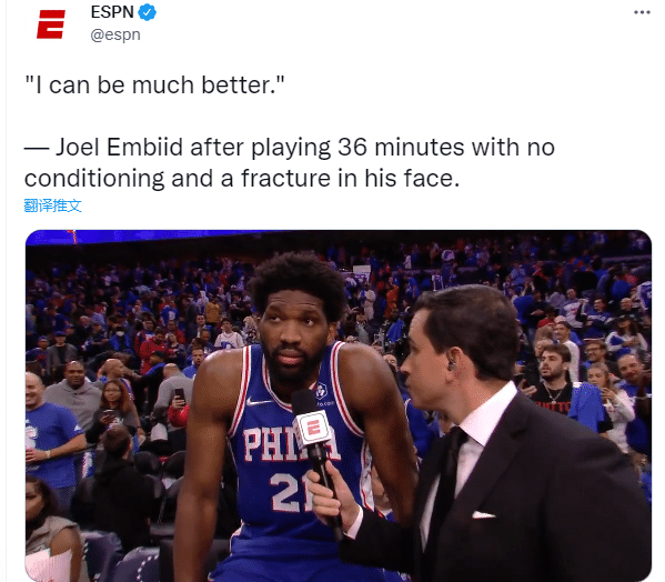 恩比德带伤复出赢球引热议,勇士球星格林发推:(这就是)恩比德的影响力。他并没有打得很好...但是,因为他的存在,其他人表现出色。