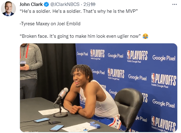 恩比德还发推晒表情包庆祝胜利;赛后马克西盛赞恩比德,还开玩笑调侃:恩比德脸骨折了,这会让他现在看起来更难看。