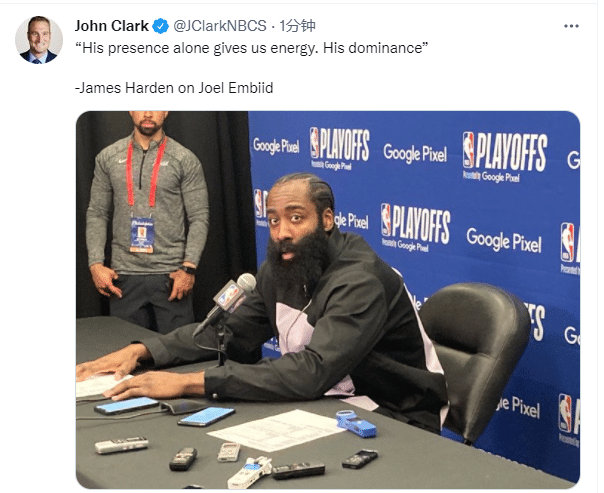 哈登也盛赞恩比德,表示:他只要在场上就给了我们能量,他的统治力。