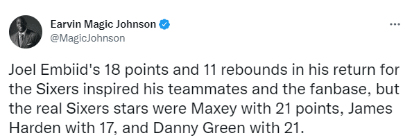 湖人名宿魔术师发推:恩比德复出拿到18分11篮板,激励了他的队友和球迷,马克西21分,哈登17分和格林21分。