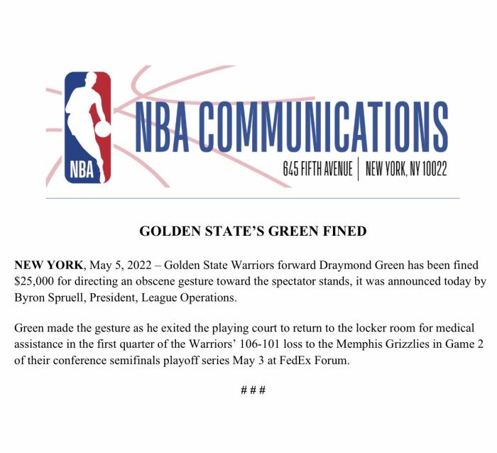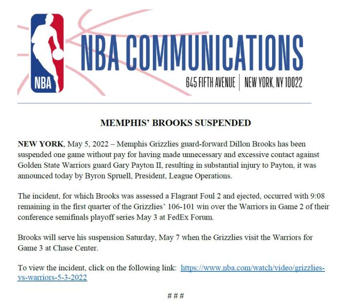 JRS直播网05月06日讯 针对勇士和灰熊系列赛G2发生的事件,NBA官方正式公布追加罚单,灰熊悍将狄龙-布鲁克斯因恶犯伤人被禁赛一场,损失8.4万美元;勇士球星德拉蒙德-格林因朝球迷竖中指被罚2.5万美元。