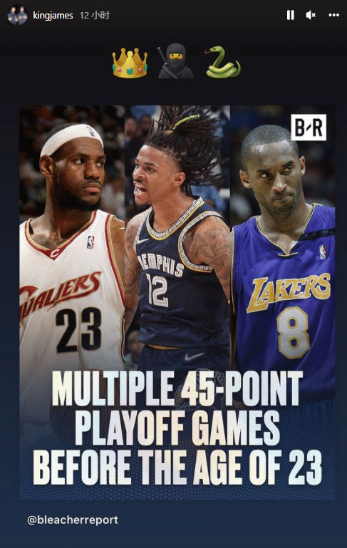 不久前,詹姆斯转发莫兰特23岁前季后赛多次轰下45+比肩詹科的纪录,配文写道:国王&忍者&曼巴;詹姆斯直呼他的忍者绰号;昨天詹姆斯全场观看灰熊和勇士G2,发推盛赞维金斯、莫兰特,直言莫兰特是个十足的球星,不该进入进步最快球员的讨论之中,还炮轰投票的人是傻子。