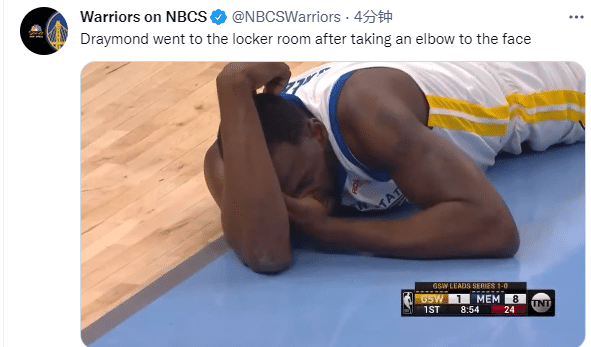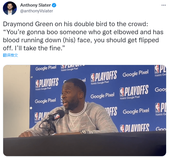 JRS直播网05月04日讯 ,西部半决赛G2勇士不敌灰熊,今日一战勇士太惨,小佩顿惨遭恶犯而提前伤退,伤情确诊为手肘骨折;库里手指流血所幸无碍,格林惨遭肘击,右眼附近撕裂流血,离场时竖中指回应被嘘;赛后格林回应此事,透露竖中指真因,并且表示愿为此交罚款。