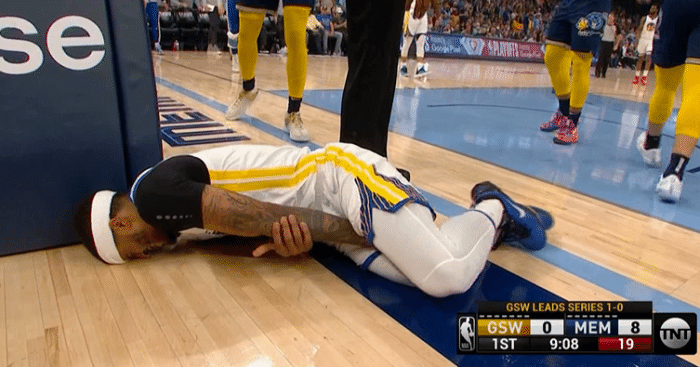 JRS直播网05月04日讯 ,NBA季后赛第二轮,勇士和灰熊G2第一节发生意外事件,小佩顿惨遭恶犯并且受伤退赛;格林的面部惨遭肘击,缝针后重返赛场,但眼睛已经肿起来了。